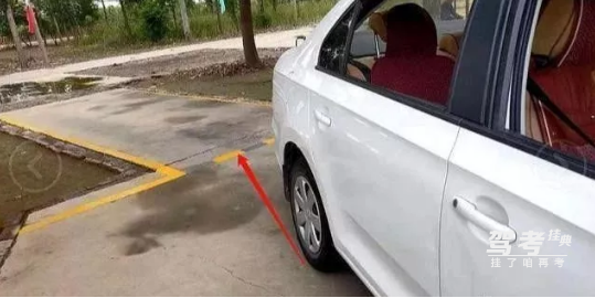在控制线打死方向,还跟原来一样,当左后视镜下沿压住控制线,迅速向右打死方向。这个点位跟学员身高,座椅前后有很大关系,不要千篇一律。如果你找不到自己合适的点,你就让车牌子落在控制线上,你坐在车里看到的点,就是你自己的点,千万不要别人看哪个点,你就看哪个点。